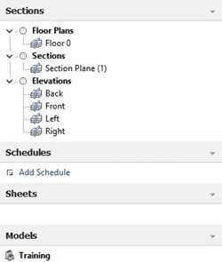 6.Istniejące przekroje, elewacje i rzuty z modelu są umieszczone w górnej sekcji „Przekroje”, model umieszczony jest na dole w sekcji „Modele”.