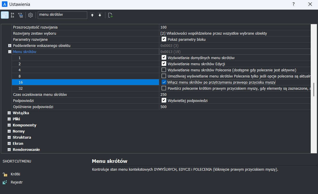 Włącz opcję: Włącz menu skrótów po przytrzymaniu prawego przycisku myszy.