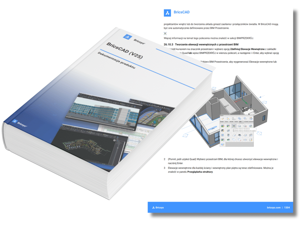 „Inside BricsCAD V20” jest przewodnikiem, który wyjaśnia wszystko co należy wiedzieć, aby rozpocząć korzystanie z BricsCAD. Począwszy od interfejsu użytkownika aż po polecenia, konfigurację i korzystanie z programu.